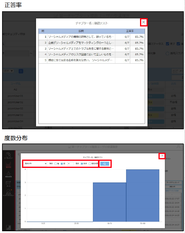 単⼀チャプター×複数ユーザの受講履歴画⾯で、平均点や各問題の正答率、テストの度数分布図を確認できます。