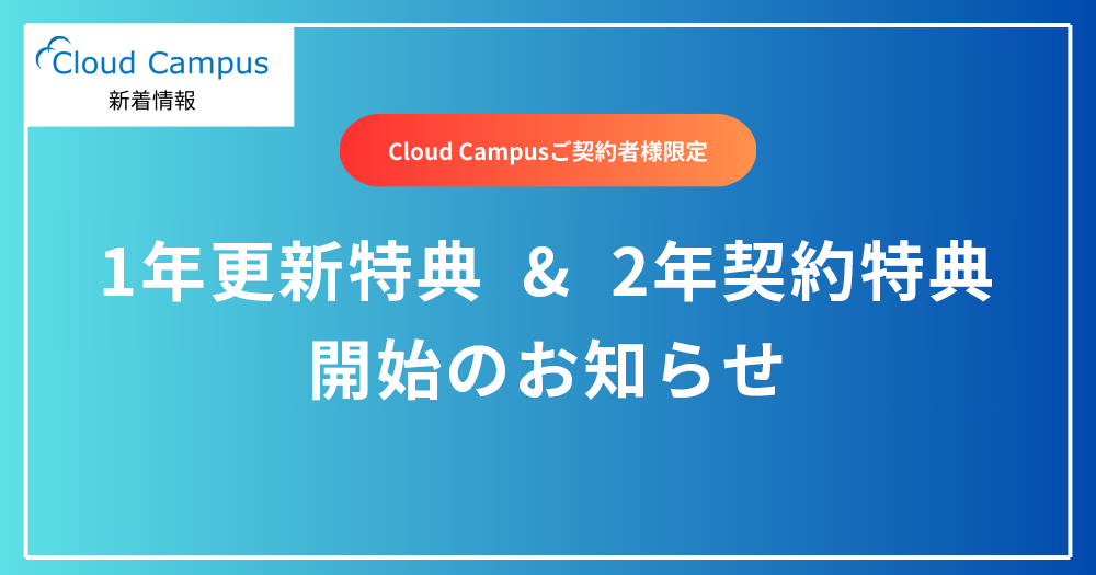Cloud Campusを次年度も契約更新いただける企業様に、対象のオプションを1つ無料でお付けします。利用期間は次年度の更新期間(通常1年間)となります。