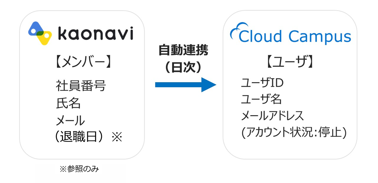 また、カオナビに退職日の登録があるメンバーについては、退職日以降にCloud Campus上のユーザ登録が自動で停止(ログイン不可)され、管理者が手動で行っていたユーザ管理の手間を省くことができます。